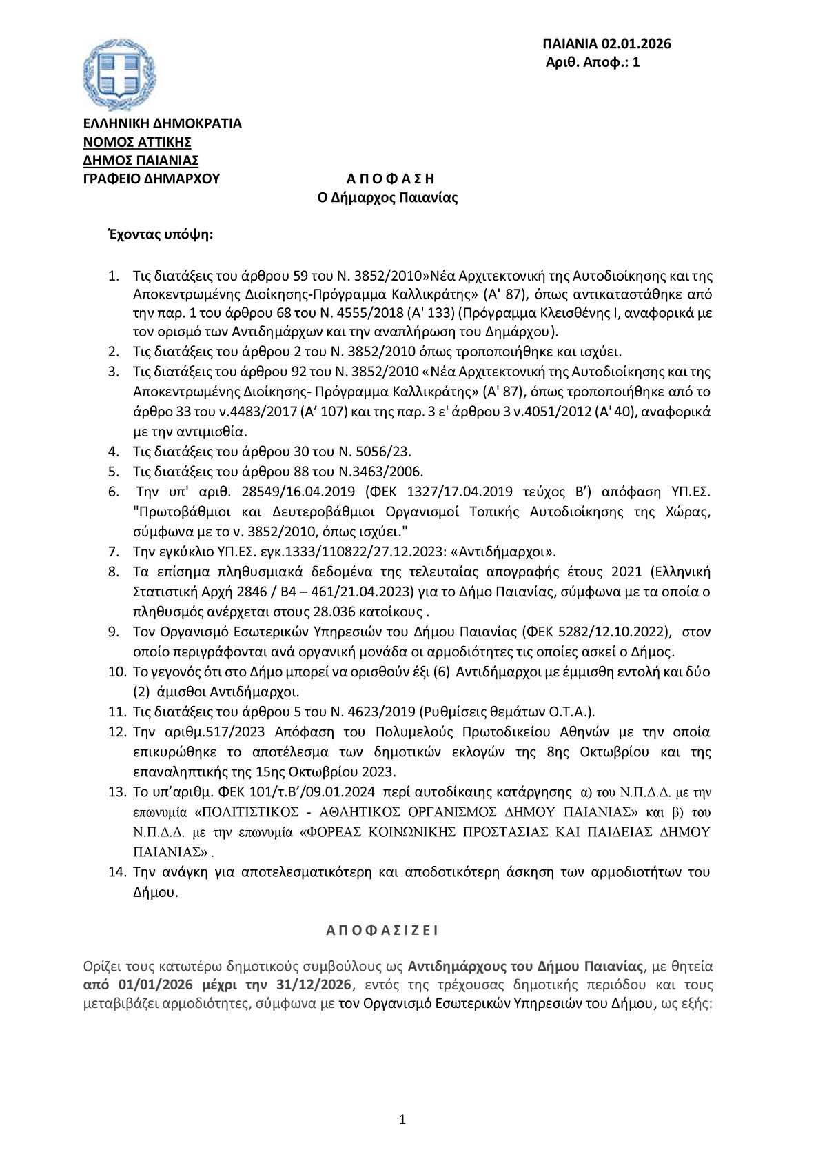 Απόφαση Δημάρχου Παιανίας για τον ορισμό αντιδημάρχων και εντεταλμένων συμβούλων