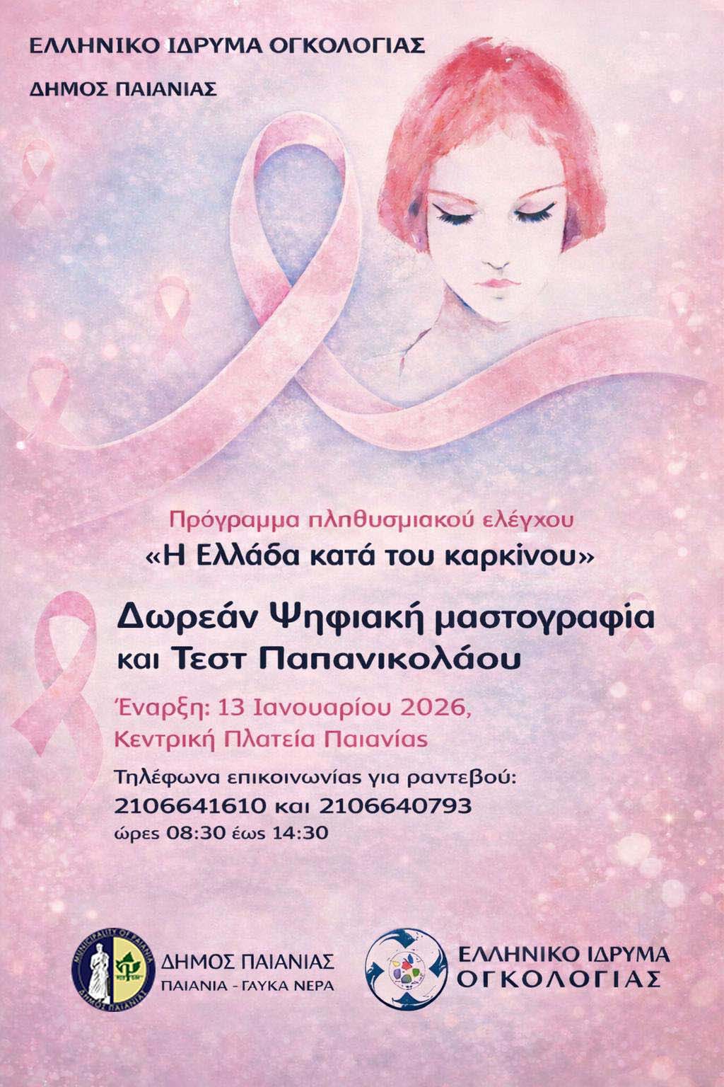 Από τις 13 Ιανουαρίου 2026 και για περίοδο ενός μήνα περίπου, γυναίκες μόνιμοι κάτοικοι του Δήμου Παιανίας, κατόπιν ραντεβού θα εξετάζονται δωρεάν χάρη στην πλήρη χορηγία του ΕΛΛΗΝΙΚΟΥ ΑΝΤΙΚΑΡΚΙΝΙΚΟΥ ΙΝΣΤΙΤΟΥΤΟΥ σε δομή που εγκαθίσταται στην κεντρική πλατεία Παιανίας. Στόχος του προγράμματος είναι η εξέταση των γυναικών ηλικίας 25 έως 69 ετών με Τεστ Παπανικολάου και των γυναικών ηλικίας από 40 ετών και άνω επιπροσθέτως με Ψηφιακή Μαστογραφία.