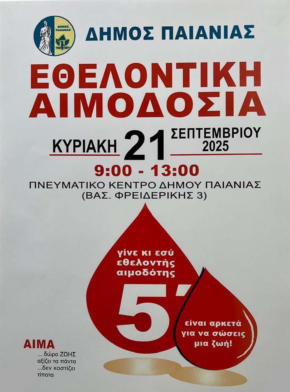 Δήμος Παιανίας: Εθελοντική αιμοδοσία την Κυριακή 21 Σεπτεμβρίου 2025