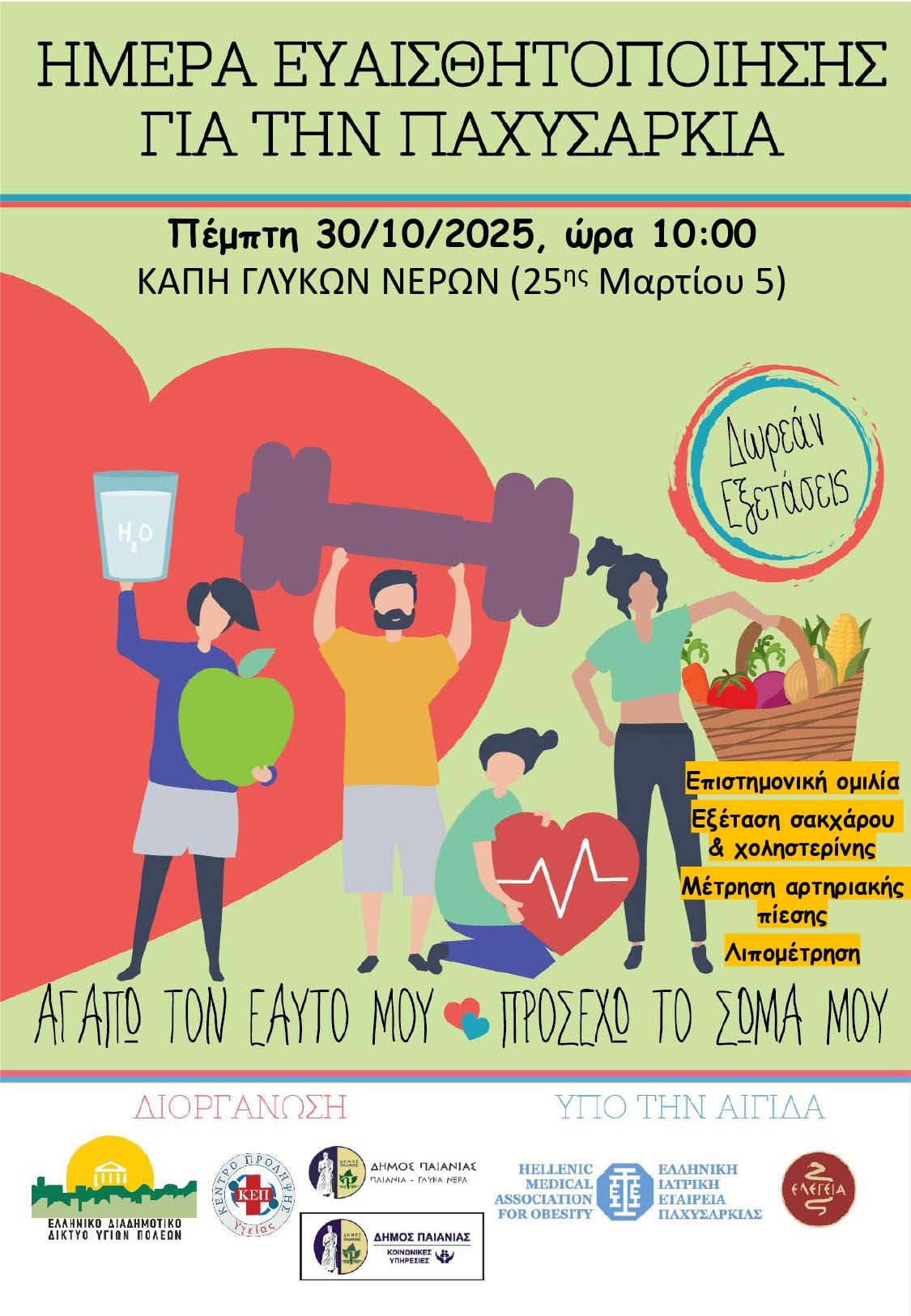 Ο Δήμος Παιανίας και η Δ/νση Κοινωνικής Πολιτικής, σε συνεργασία με το Ελληνικό Διαδημοτικό Δίκτυο Υγιών Πόλεων (ΕΔΔΥΠΠΥ) και το ΚΕΠ ΥΓΕΙΑΣ, σας προσκαλούν την Πέμπτη 30/10/2025 και ώρες 10.00 π.μ. – 13.00 μ.μ., στο Κ.Α.Π.Η. Γλυκών Νερών (οδός 25ης Μαρτίου 5, Γλυκά Νερά), στη δράση: Ημέρα ευαισθητοποίησης για την παχυσαρκία (Επιστημονική ομιλία, Εξέταση σακχάρου & χοληστερίνης, Μέτρηση αρτηριακής πίεσης και Λιπομέτρηση).