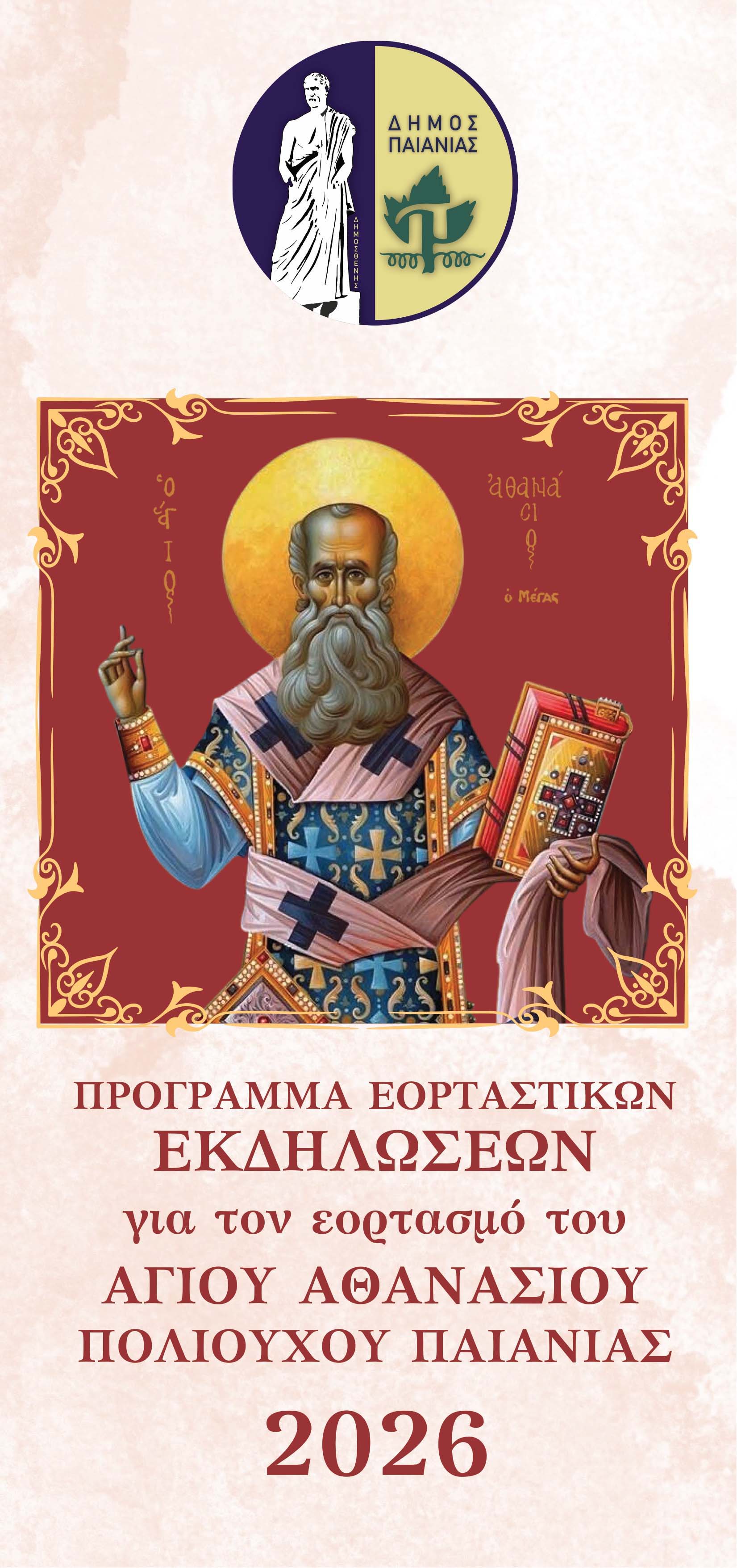 Όπως και ο ίδιος ο Δήμαρχος Παιανίας Ισίδωρος Μάδης σημειώνει στο μήνυμά του, «με απόλυτο σεβασμό στην παράδοση του τόπου μας, αλλά και στον κάθε δημότη ξεχωριστά, γιορτάζουμε τον Άγιο Αθανάσιο, με πολυποίκιλες εκδηλώσεις και δράσεις, για όλες τις ηλικιακές ομάδες.
