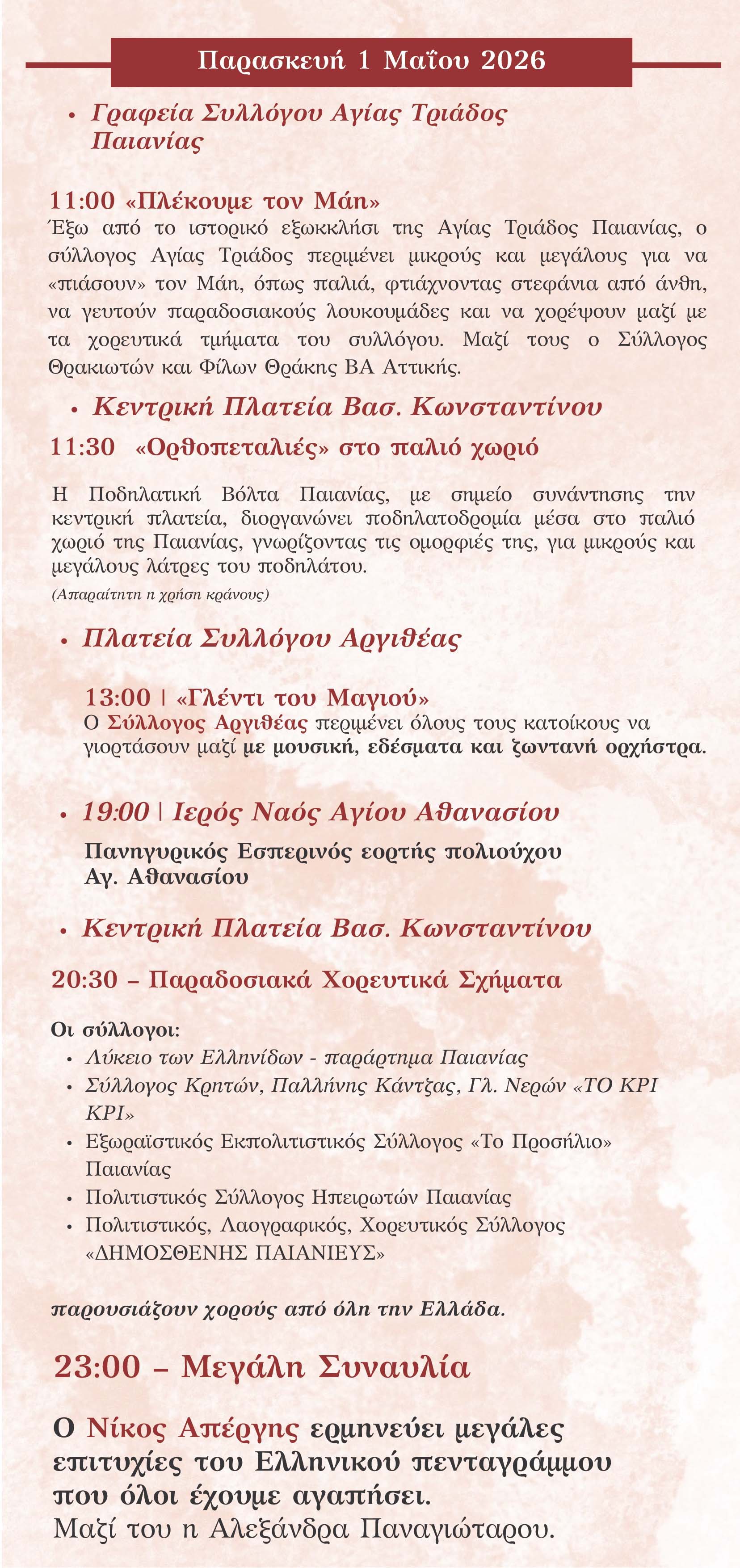 • Την Παρασκευή 1η Μαΐου 2026 στην Κεντρική Πλατεία Βασ. Κωνσταντίνου ο Νίκος Απέργης ερμηνεύει μεγάλες επιτυχίες του Ελληνικού πενταγράμμου που όλοι έχουμε αγαπήσει. Μαζί του η Αλεξάνδρα Παναγιώταρου.