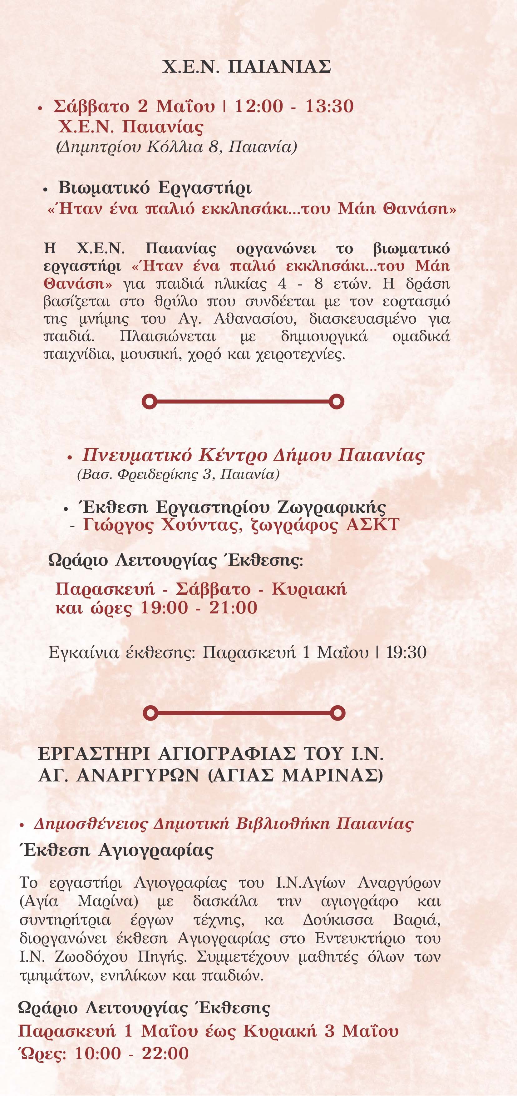 Στην παράδοση, τις τέχνες και την ιστορία είναι βασισμένο το φετινό εορταστικό πρόγραμμα του Δήμου Παιανίας προς τιμή του Πολιούχου Αγίου Αθανασίου. Πρωταγωνιστικό ρόλο διατηρούν για ακόμα μια χρονιά οι πολιτιστικοί φορείς του δήμου σε εκδηλώσεις που ξεκινούν την Πρωτομαγιά και ολοκληρώνονται την Κυριακή 3 Μαΐου.