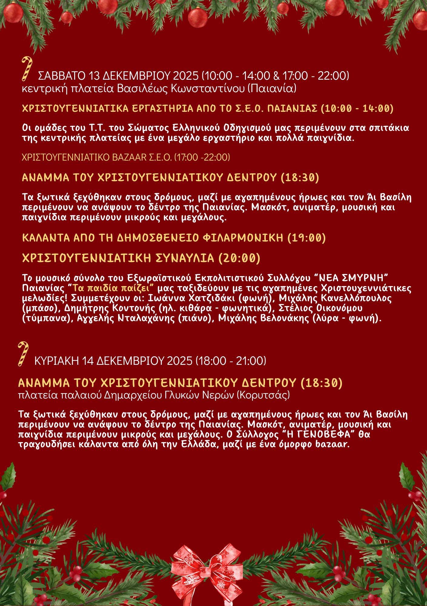 Η αρχή γίνεται από την κεντρική πλατείας της Παιανίας (Βασιλέως Κωνσταντίνου) το Σαββάτο 13 Δεκεμβρίου οπότε στις 18.30 θα ανάψει το χριστουγεννιάτικο δέντρο παρουσία του Άι Βασίλη και των ξωτικών του ενώ μασκότ και ανιματέρ θα υποδεχθούν τους δημότες με μουσική και παιχνίδια. Τη σκυτάλη θα πάρει η Δημοσθένειος Φιλαρμονική για τα κάλαντα ενώ το μουσικό σύνολο του Εξωραϊστικού Εκπολιτιστικού Συλλόγου “Νέα Σμύρνη” Παιανίας, “Τα παιδία παίζει” θα απογειώσουν το εορταστικό κλίμα με χριστουγεννιάτικες μελωδίες.