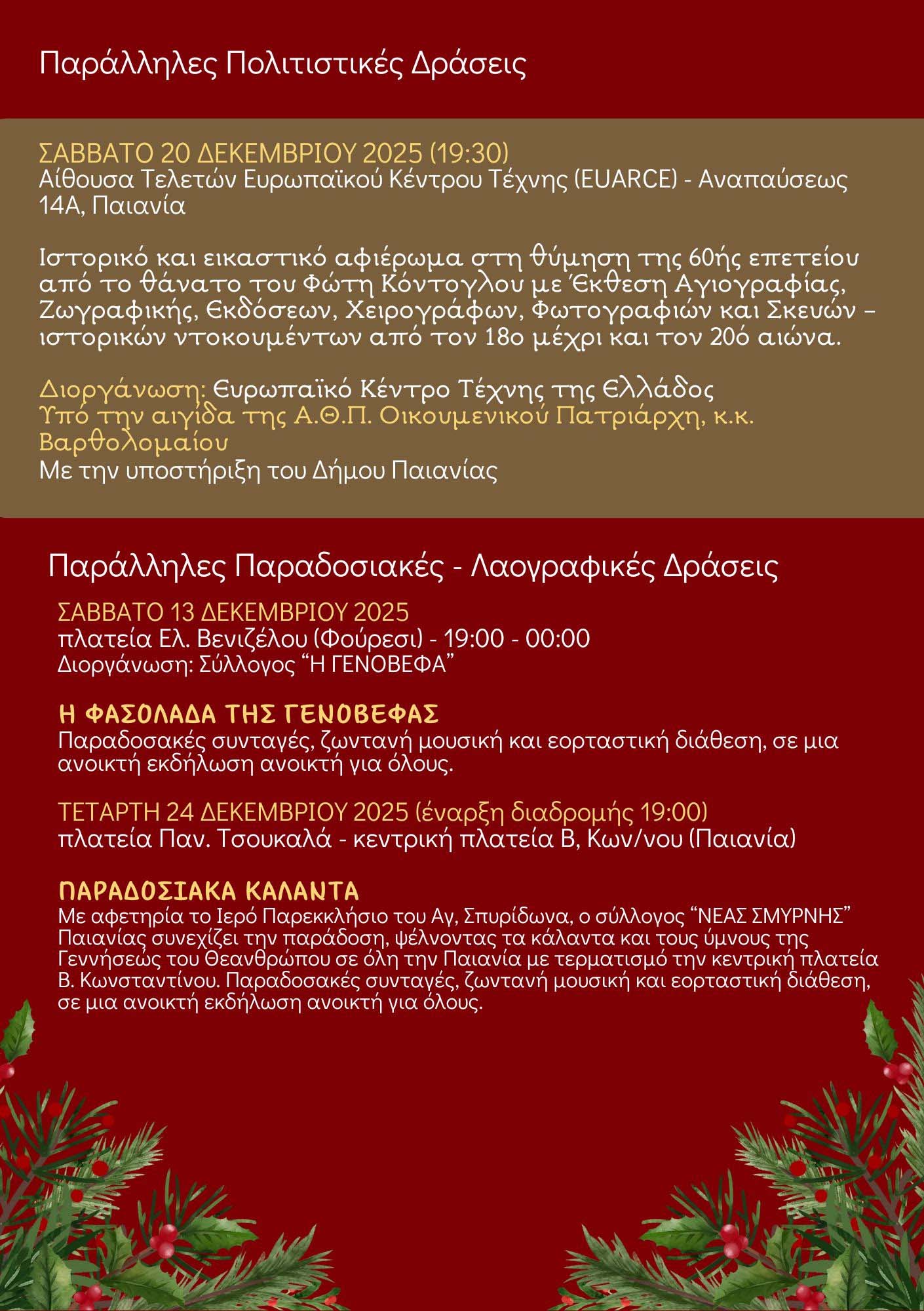 Σε γιορτινή διάθεση μπαίνει ο Δήμος Παιανίας υποδεχόμενος τα Χριστούγεννα και την Πρωτοχρονιά με εκδηλώσεις για μικρούς και μεγάλους.