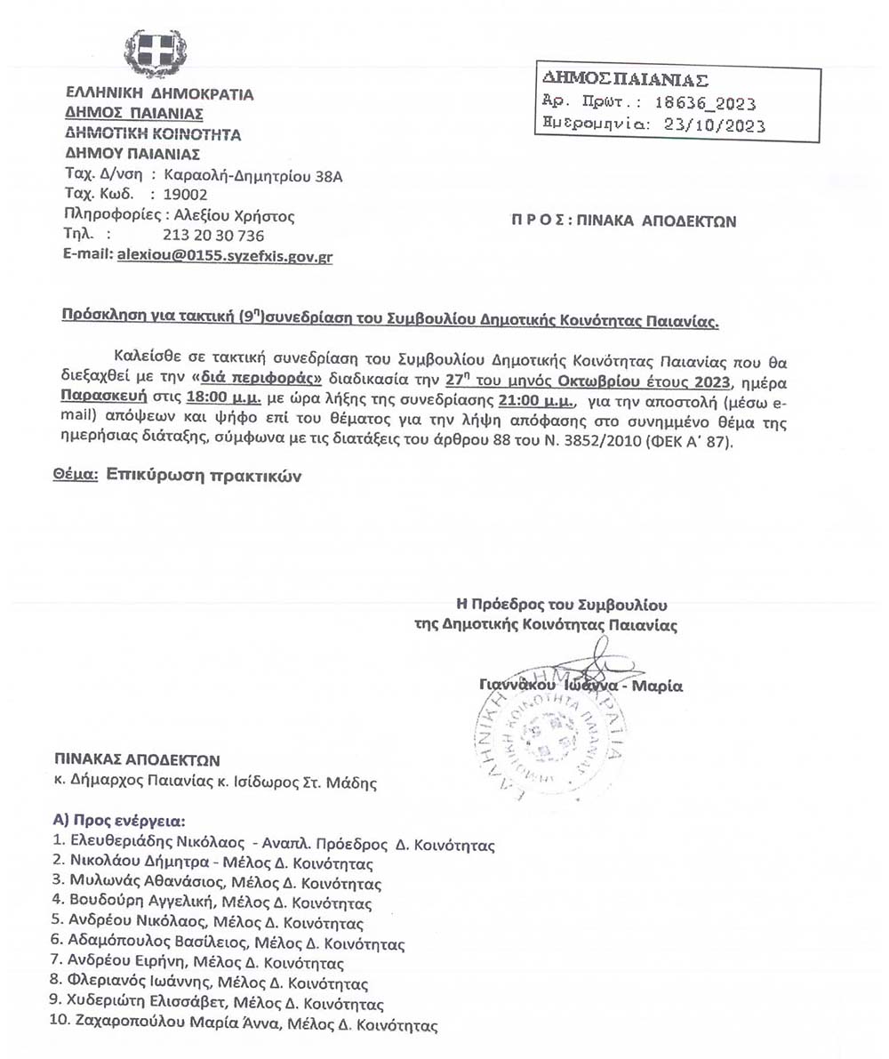 Πρόσκληση για τακτική (9η) συνεδρίαση του Συμβουλίου Δημοτικής Κοινότητας Παιανίας