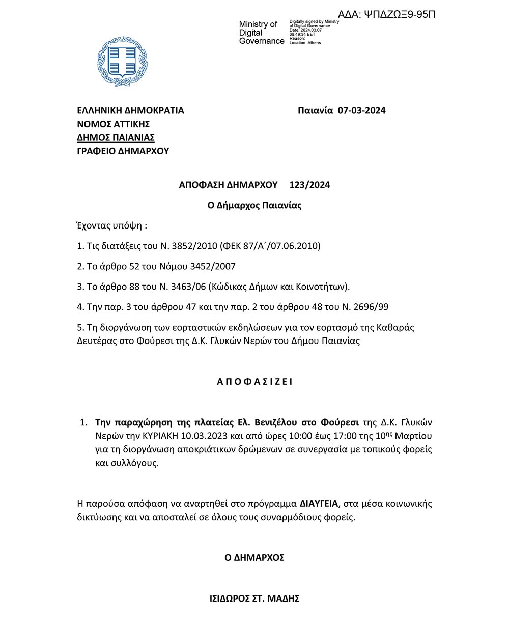 Απόφαση Δημάρχου για την παραχώρηση της πλατείας Ελ. Βενιζέλου στο Φούρεσι