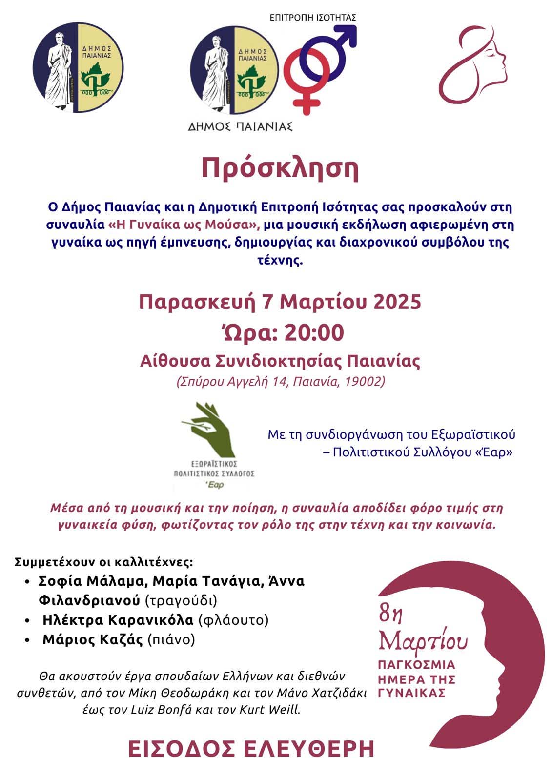 Ο Δήμος Παιανίας και η Δημοτική Επιτροπή Ισότητας με αφορμή την Παγκόσμια Ημέρα της Γυναίκας, διοργανώνουν μουσική εκδήλωση με τίτλο «Η Γυναίκα ως Μούσα» αφιερωμένη στη γυναίκα ως πηγή έμπνευσης, δημιουργίας και διαχρονικού συμβόλου της τέχνης.
