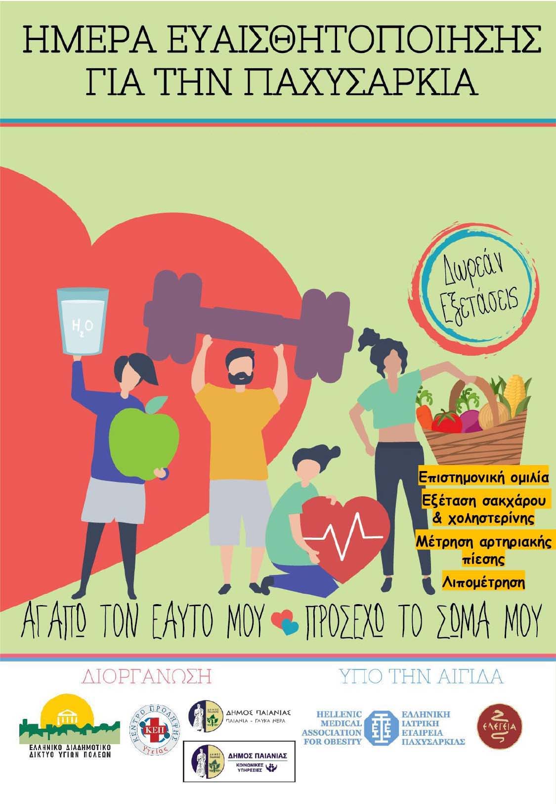 Συνεχίζονται οι δράσεις του Δήμου Παιανίας για τη θωράκιση της υγείας των δημοτών με δωρεάν εκδηλώσεις συνδυαστικά με δωρεάν εξετάσεις. Ενώ στην κεντρική πλατεία της Παιανίας συνεχίζεται, σε συνεργασία με το «ΕΛΛΗΝΙΚΟ ΙΔΡΥΜΑ ΟΓΚΟΛΟΓΙΑΣ» στο πλαίσιο του προγράμματος «Η ΕΛΛΑΔΑ ΚΑΤΑ ΤΟΥ ΚΑΡΚΙΝΟΥ», πρόγραμμα προληπτικών εξετάσεων για γυναίκες, την Πέμπτη 12 Φεβρουαρίου έχει προγραμματιστεί ημέρα ευαισθητοποίησης για την παχυσαρκία.