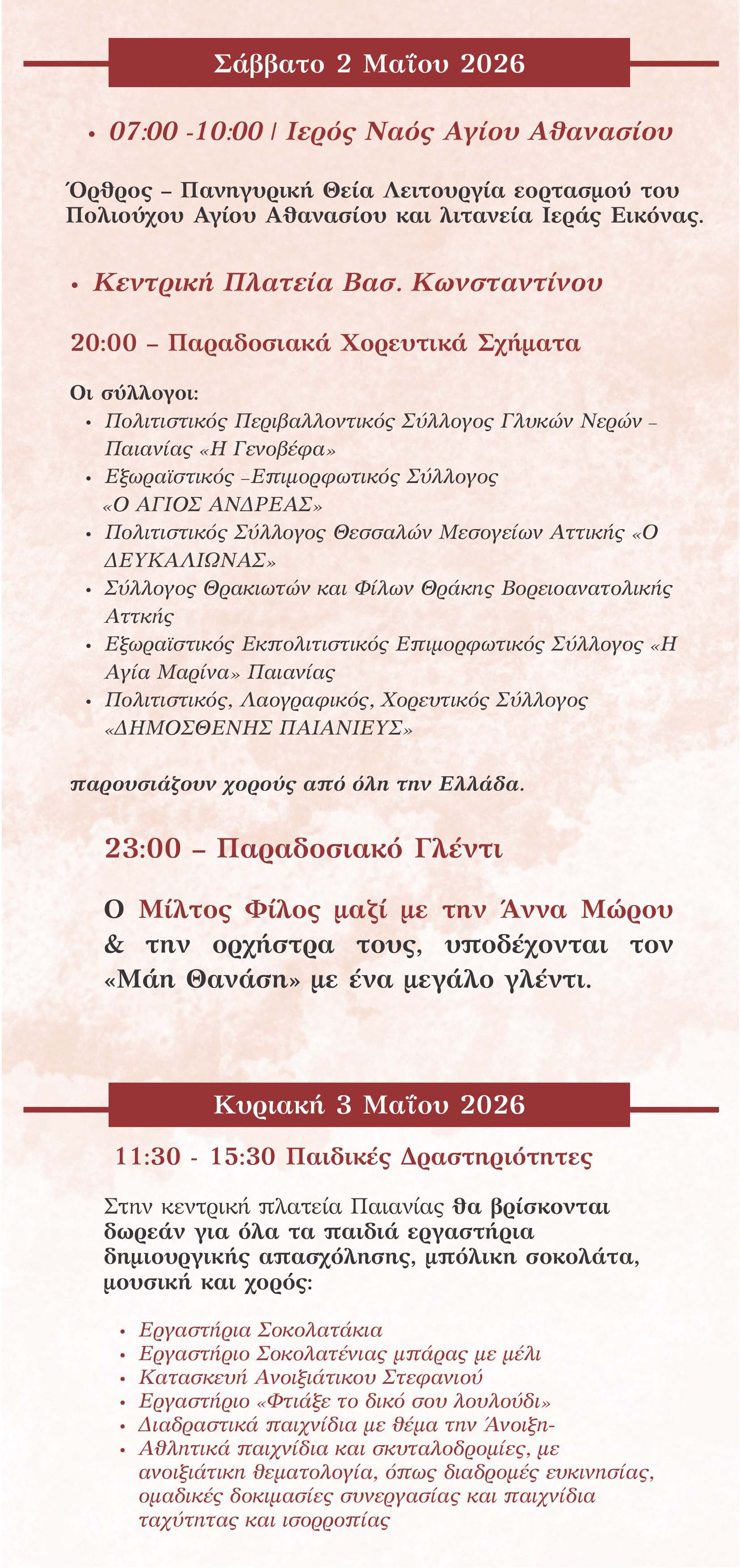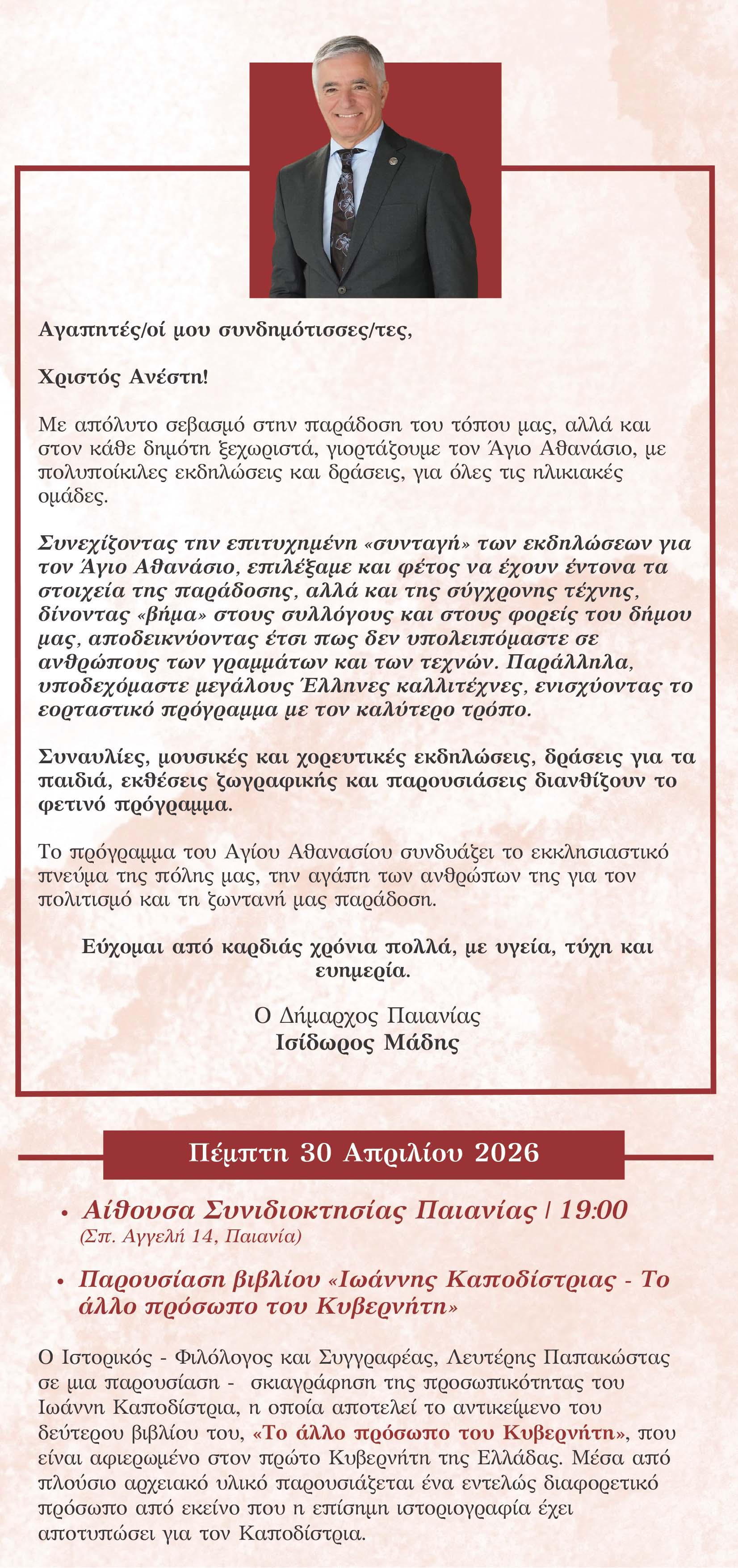 Όπως και ο ίδιος ο Δήμαρχος Παιανίας Ισίδωρος Μάδης σημειώνει στο μήνυμά του, «με απόλυτο σεβασμό στην παράδοση του τόπου μας, αλλά και στον κάθε δημότη ξεχωριστά, γιορτάζουμε τον Άγιο Αθανάσιο, με πολυποίκιλες εκδηλώσεις και δράσεις, για όλες τις ηλικιακές ομάδες.